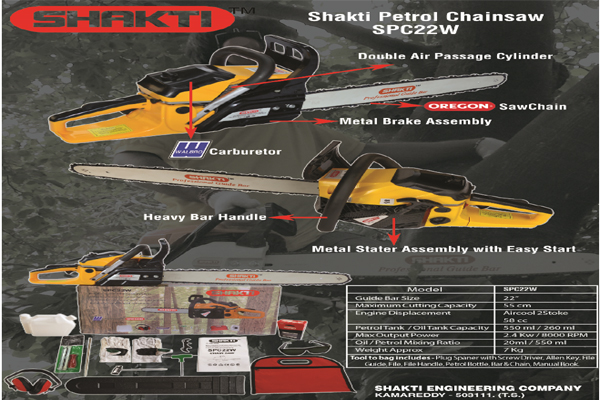SHAKTI SPC 22R comes with 58cc chain saw is designed for home & semi-pro usage. Whether you need to clean some branches or cut up a stack of firewood this chain saw will do the job with ease. Stable and powerful engine used for most forestry, agricultural and emergency work. Compact and smooth exterior design, more user-friendly and much easier to operate.
